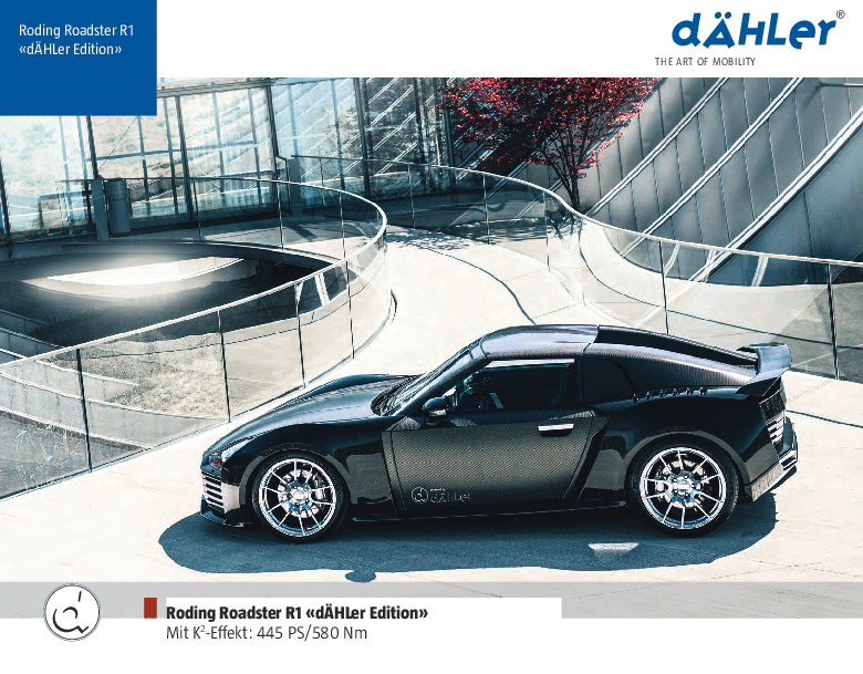 dÄHLer Design & Technik GmbH hat für den absolut exklusiven Roding Roadster R1 aufgrund der langjährigen Erfahrung und Kompetenz im Umgang mit optimierten BMW-Modellen und leistungsgesteigerten BMW-Motoren genau die stimmige Antwort auf die spezifischen Bedürfnisse ihrer Kunden für ein noch individueller abgestimmtes Fahrzeug. «Unser Schweizer Partner Christoph Dähler hat aus seiner langjährigen Erfahrung und Praxis wertvolle Vorstellungen einbringen können, die uns zu vielen neuen Ideen inspiriert haben und uns dabei unterstützen, noch innovativer und individueller auf die Wünsche unserer Kunden eingehen zu können» resümiert Frank Berger, Vertriebsleiter bei Roding, die Kooperation.