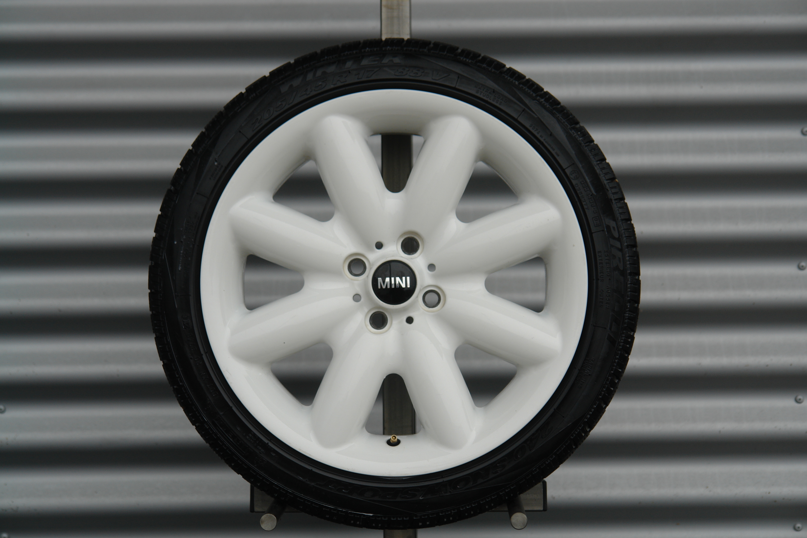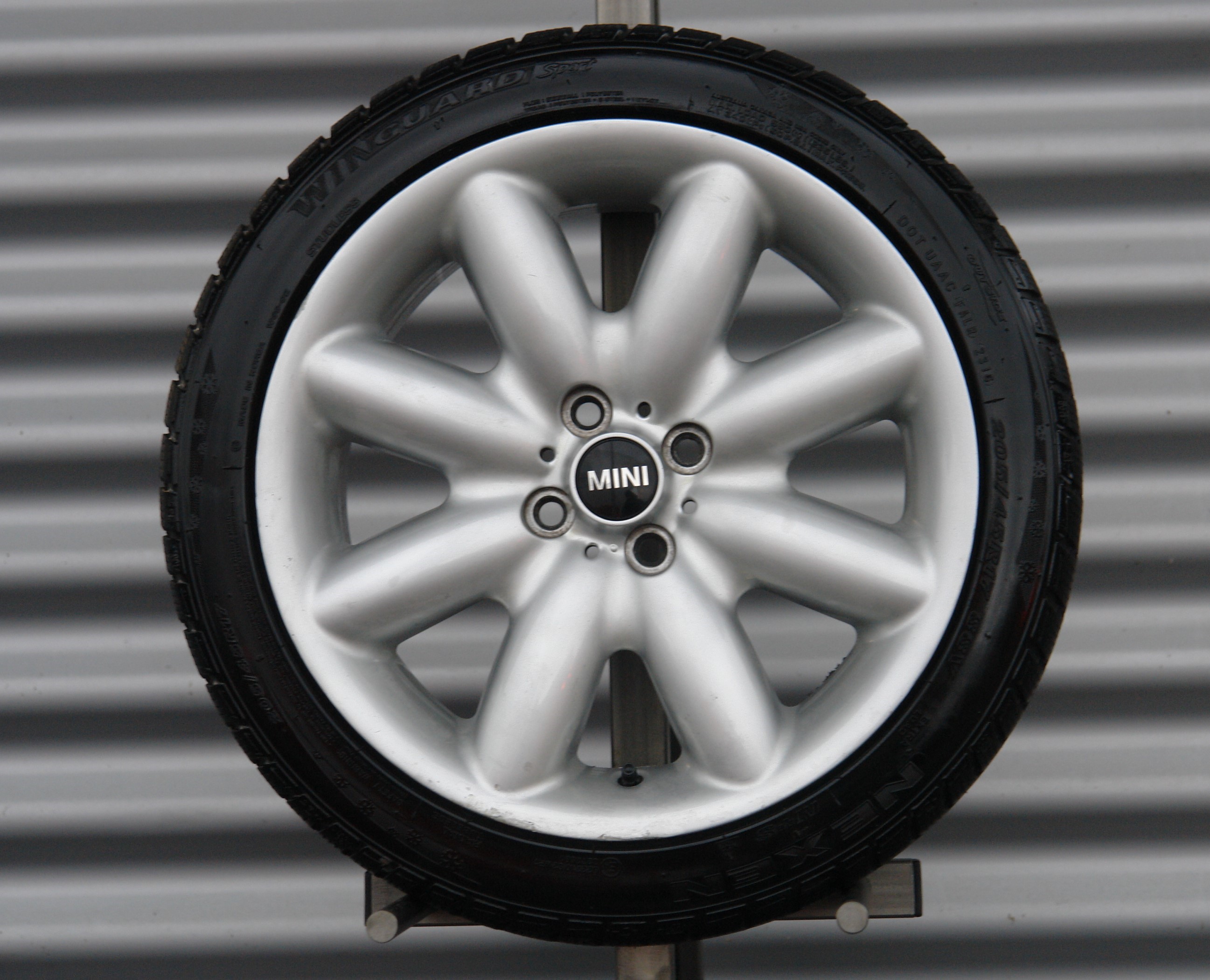 Marke: MINI | Design: Spoke 85| Farbe: Silber | Grösse: 17 Zoll, VA: 7x17 ET 48, HA: 7x17 ET 48 | Bereifung: Winterreifen Nexen Winterguard, VA: 205/45 17, HA: 205/45 17 | Zustand: Repariert | Passend zu: MINI R50, R52, R53, R55, R55N, R56